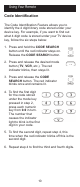 Using Your Remote Code Identification The Code Identification Feature allows you to identify the 4 digit library code stored under your device key. For example, if you want to find out what 4 digit code is stored under your TV device key, follow the six steps below: 1. Press and hold the CODE SEARCH button until the red indicator stays on. Release the CODE SEARCH button. 2. Press and release the desired mode button (TV, VCR, etc.). The red indicator blinks, then stays lit. 3.