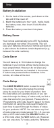 Setup Battery Installation 1. On the back of the remote, push down on the tab and lift the cover off. 2. Match the batteries to the + and - marks inside the battery case, then insert 2 AAA Alkaline batteries. 3. Press the battery cover back into place. Battery Saver Your remote automatically turns off if the buttons are depressed more than 30 seconds. This will save your batteries should your remote get stuck in a place where the buttons remain depressed (e.g., between the sofa cushions).