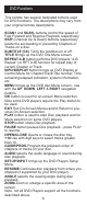 Button Functions, cont. Turns Backlight on and off. ON•OFF Turns product On or Off. CHANNEL Up/Down Changes the channels TRACK +/- controls DVD/CD track selection i.e. DVD/CD Track Skip Up/Down (in DVD and CD modes). INFO/DISPLAY button brings up DVD Display or Control Menu for Chapter/ Track/Title number, Time remaining/elapsed indication, system information, etc. VOLUME UP/DOWN Changes the volume level of the product, normally the TV.