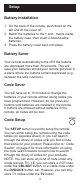 Setup Battery Installation 1. On the back of the remote, push down on the tab and lift the cover off. 2. Match the batteries to the + and - marks inside the battery case, then insert 2 AAA Alkaline batteries. 3. Press the battery cover back into place. Battery Saver Your remote automatically turns off if the buttons are depressed more than 30 seconds. This will save your batteries should your remote get stuck in a place where the buttons remain depressed (e.g., between the sofa cushions).