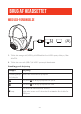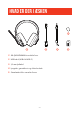 PRODUKTOVERSIGT Kontrolelementer på headset 01 08 02 03 09 04 05 06 10 07 01 / • Ring op Afbalancerer lydstyrken for chat i forhold til spillets lydstyrke. 02 Indstillingsknap for lydstyrke +/• Justerer lydstyrken for headsettet. 03 Aftagelig skumhætte 04 LED-indikator for mikrofon til/fra • Lyser, hvis mikrofonen er slået fra. 05 RGB-oplyst JBL-logo 06 3,5 mm lydstik 07 Boom-mikrofon med stemmefokus • Slå op for at slå mikrofonen fra - eller ned for at slå mikrofonen til.