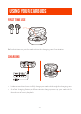 5. Follow the onscreen instructions to personalize your sound settings. JBL Quantum TWS JBL Quantum TWS How to wear 01 02 R R 03 1. Choose a pair of silicone ear tips that best fits your ear size. 2. Turn the earbuds in your ears as shown for the best fit and audio performance. 3. After Bluetooth connection (see “Power on & connect via Bluetooth”), open the JBL Headphones app to find the earbuds, then follow on-screen instructions for calibration.