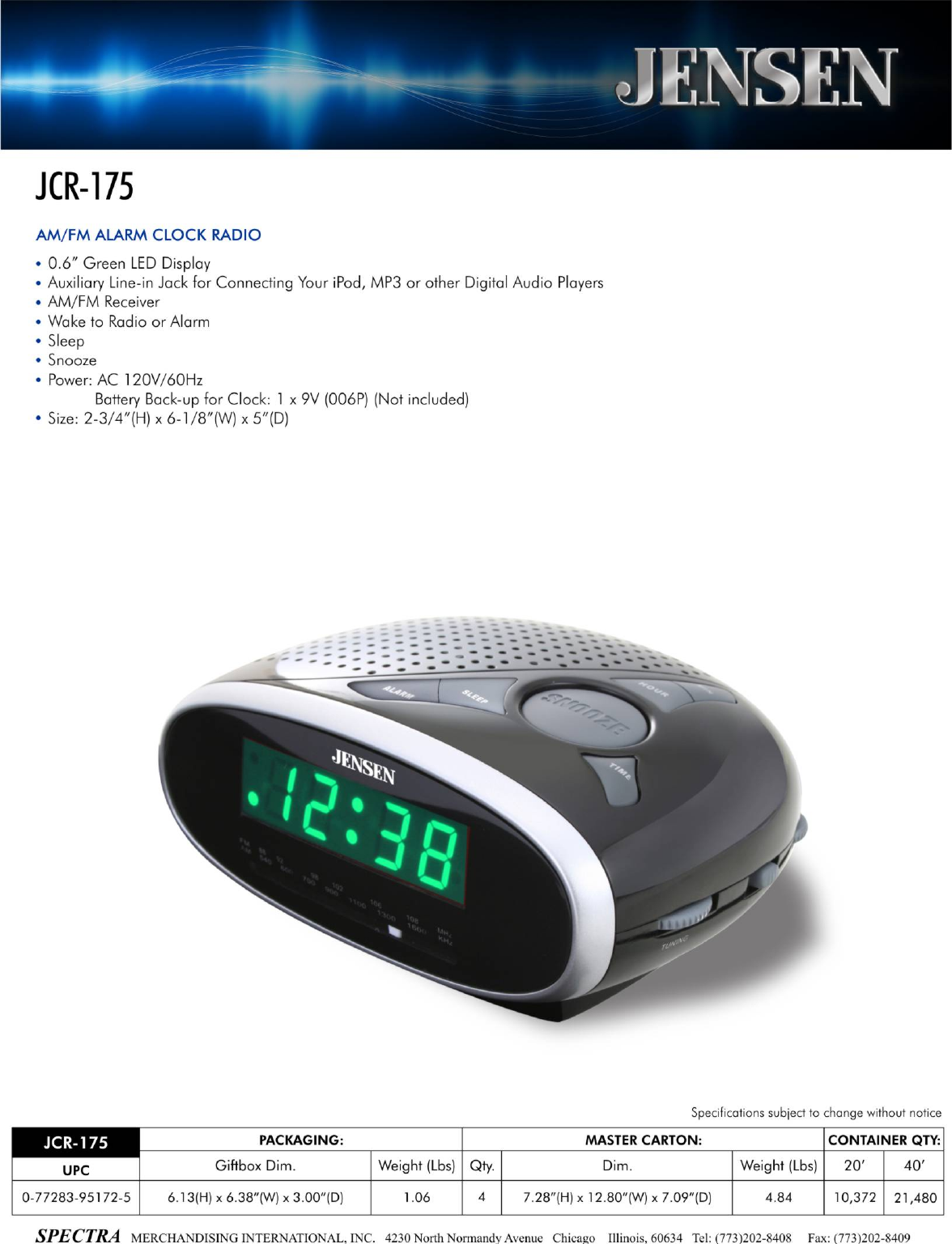 Amfm Alarm Clock Radio JCR175 Specification Sheet