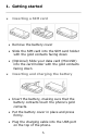 1. Getting started Inserting a SIM card Remove the battery cover Slide the SIM card into the SIM card holder with the gold contacts facing down (Optional) Slide your data card (MicroSD) into the card holder with the gold contacts facing down Inserting and charging the battery Insert the battery, making sure that the battery contacts touch the phone’s gold contacts. Put the battery cover in place and press firmly. Plug the charging cable into the USB port on the top of the phone.