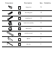 Component Description Qty k Fixing screw 5 m Short fixing bolt 4 n Long fixing bolt 2 o Swivel castor (braked) 2 p Swivel castor 3 q Self adhesive pads 5 r Spanner 1 s Allen key 1 Packed by