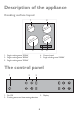 Description of the appliance Cooking surface layout 1 145 2 mm 180 145 m 0m 21 5 4 1. Single cooking zone 1200W 2. Single cooking zone 1800W 3. Single cooking zone 1200W mm mm 3 4. Control panel 5. Single cooking zone 2300W The control panel 1 2 3 1. On/Off 2. Cooking zones and heat setting selection 3.