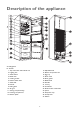 Description of the appliance A- Refrigerator B - Freezer 1. Top with switch and indicator set 2. Lighting box 3. Glass shelves 4. Bottle rack 5. Cooling surface 6. Defrost water drain 7. Glass shelf 8. Drawer 9. Rating plate 10. Air grid 11. Storing compartment(s) 12. Freezing compartment 13. Bottom plinth 14. 15. 16. 17. 18. 19. 20. 21. 22. 23. 24. 25. 26. 27.