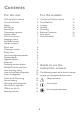 Contents For the user For the installer Safety information 2 Control Panel 6 6 6 6 6 7 7 7 7 7 Display Switching on Switching off Temperature regulation Functions Menu Child Lock Function Shopping Function Eco Mode Function Holiday Function H First use Cleaning the interior Daily use Use of the fridge compartment Movable shelves Vegetable Drawer Bottle rack Positioning the door shelves Helpful hints and tips Hints for energy saving Hints for fresh food refrigeration Hints for refrigeration Care an