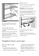 • position food so that air can circulate freely around it • The thermic dilatation might cause a sudden cracking noise. This is not a fault with the appliance and is a completely normal operating sound. Hints for refrigeration Useful hints: Meat (all types) : wrap in polythene bags and place on the glass shelf above the vegetable drawer. For safety, store in this way only one or two days at the most. Cooked foods, cold dishes, etc..: these should be covered and may be placed on any shelf.