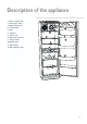 Description of the appliance 1 Dairy compartments 2 Can storage shelves 3 Bottle storage shelf 4 Control panel 5 Light 6 Ventilator 7 Cold air exit 8 Bottle and can holder 9 Storage shelves 10 Bottle holder 11 Salad crispers 12 Water discharge hole 4 5 7 6 1 8 9 2 9 10 9 12 9 3 11 5