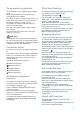 Contents For the User For the Installer 2 Installation 16 Description of the appliance 5 Technical Specification 16 Control panel 6 Display 6 Important Safety Information Electrical Connection 17 18 When the Fridge is first installed 6 Positioning Temperature control 7 Rear spacers 18 Functions menu 7 Shelf holders 19 Ambient temperature function 7 Child lock function 7 Door Reversibility 19 Shopping function 7 Eco mode function 7 Quick chill function 7 Holiday function