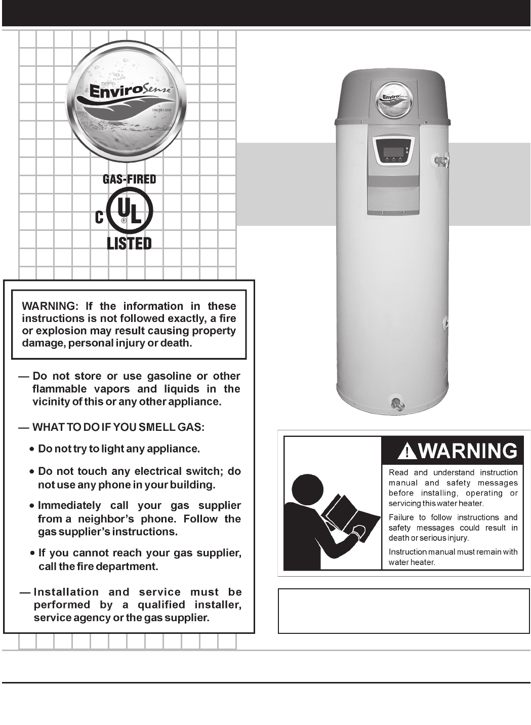 Instruction Manual RESIDENTIAL GAS WATER HEATERS POWER VENT/POWER DIRECT VENT GAS MODELS WITH HOT SURFACE IGNITION CANADIAN MANUAL • For Your Safety • AN ODORANT IS ADDED TO THE GAS USED BY THIS WATER HEATER. ALL TECHNICAL AND WARRANTY QUESTIONS: SHOULD BE DIRECTED TO THE LOCAL DEALER FROM WHOM THE WATER HEATER WAS PURCHASED. IF YOU ARE UNSUCCESSFUL, CALL THE TECHNICAL SUPPORT PHONE NUMBER SHOWN ON THE WATER HEATER LABELING.