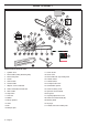 WHAT IS WHAT? What is what on the chain saw? 1 Cylinder cover 17 Chain catcher 2 Front handle (Felling direction guide) 18 Clutch cover 3 Front hand guard 19 Rear handle with right hand guard 4 Starter 20 Throttle control 5 Chain oil tank 21 Throttle lockout 6 Starter handle 22 Decompression valve 7 Adjuster screws carburetor 23 Combination spanner 8 Choke control/Start throttle lock 24 Chain tensioning screw 9 Rear handle 25 Operator’s manual (EPA) 10 Stop switch 26 Bar guard