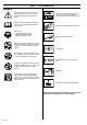 SAFETY INSTRUCTIONS GENERAL SAFETY PRECAUTIONS 1 2 7 FUEL SAFETY (Refuelling, fuel mixture, storage.) Chain saws are designed solely for cutting wood. The only cutting equipment that can be used with this chain saw are the combinations of bars and chains recommended in the ”Technical data” section. Never use a chain saw if you are tired, if you have drunk alcohol, or if you are taking medication that affects your vision, your judgement or your coordination. 3 Always wear suitable protective clothing.