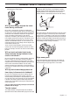 ASSEMBLY Fitting the bar and chain ! should be tensioned until it does not sag from the underside of the bar. WARNING! Always wear gloves, when working with the chain. CS 2245 Check that the chain brake is in disengaged position by moving the front hand guard towards the front handle. The chain is correctly tensioned when it does not sag from the underside of the bar, but can still be turned easily by hand. Hold up the bar tip and tighten the bar nuts with the combination spanner.