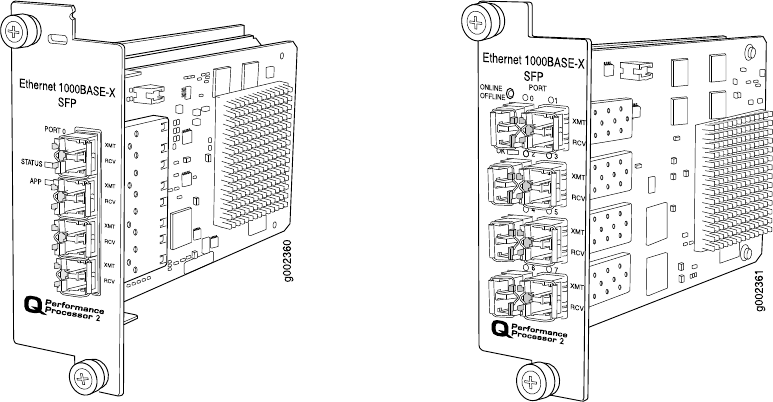 Left: 1-port Gigabit Ethernet IQ2 PIC (Type 1); Right: 8-port Gigabit Ethernet IQ2 PIC (Type 2)