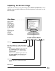 Adjusting the Screen Image Adjust the screen image using the buttons on the Front Control Panel to select from the menus and make adjustments. For descriptions of each control see the next few pages. ○ ○ ○ ○ ○ ○ ○ ○ See the steps below for accessing the menus. See the next few pages for descriptions of menu selections. All menus and adjustment screens disappear automatically.