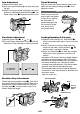 Grip Adjustment Tripod Mounting 1) Separate the Velcro strip. 2) Pass your right hand through the loop and grasp the grip. 3) Adjust so that your thumb and fingers can easily and operate the Recording Start/Stop Button Power Zoom Lever . Refasten the Velcro strip. Align the screw and camera direction stud on the tripod with the tripod mounting socket . Then tighten the screw. W ! 3 CAUTION When using a tripod, be sure to open and extend its legs fully to stabilise the camcorder.