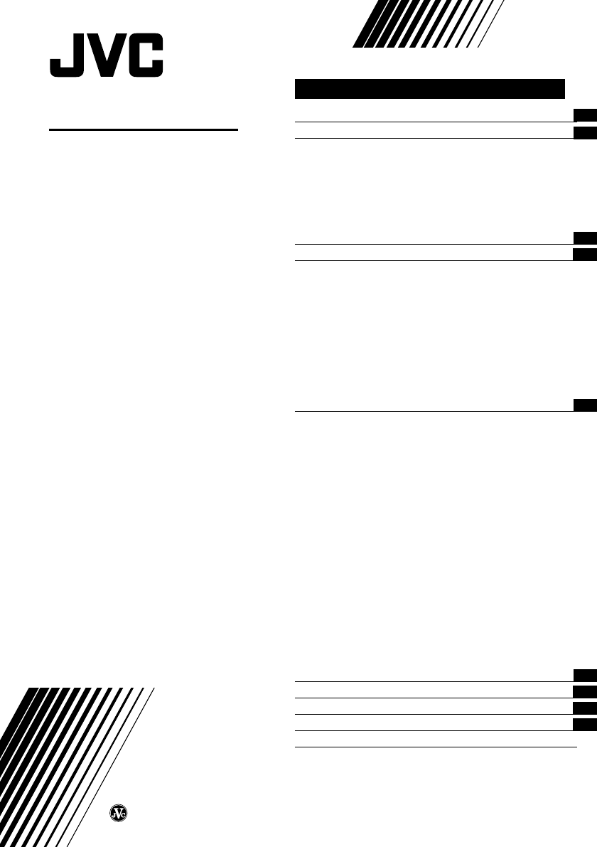 規格 電視RF制式 M 彩色制式 NTSC 頻道 VHF 2至13, VHF14至69 副中頻、高頻、超高頻和極高頻頻道 外接輸入 輸出 VIDEO-1: VIDEO 輸入, AUDIO L/R 輸入 VIDEO-2/COMPONENT: VIDEO 輸入, AUDIO L/R 輸入, COMPONENT VIDEO (Y/CB/CR) 輸入 VIDEO-3: VIDEO 輸入, AUDIO L/R 輸入 OUTPUT: VIDEO 輸出 , AUDIO L/R 輸出 耳機插口: 立體聲微型插口(直徑3.5毫米) 聲音多重制式 BTSC(多頻道音響) 目錄 彩色電視機 使用說明書 感謝惠購JVC彩色電視機。 請在使用電視機前通讀本說明書,以便 掌握新電視機的使用方法。 安全須知 準備 1 2 3 4 5 6 確認遙控器的種類 ....................... 3 將電池裝入遙控器 ....................... 3 連接天線和錄像機 ...................... 4 連接其他裝置 ..........................