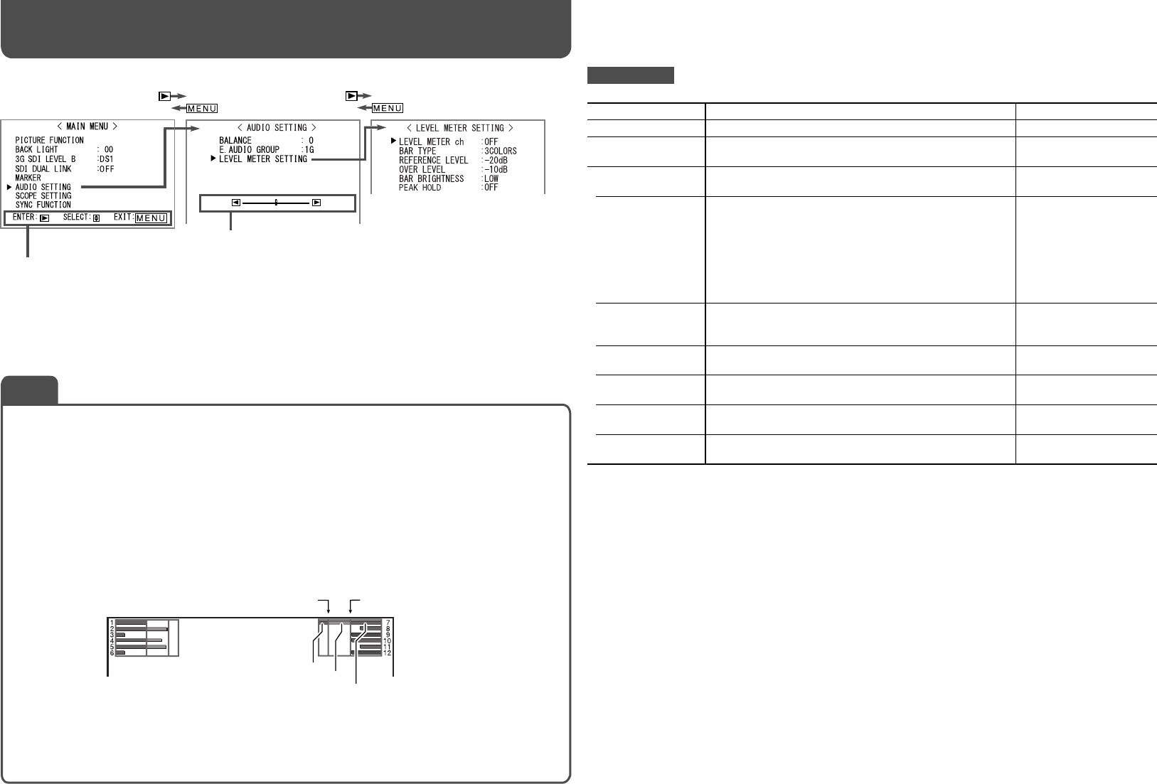 • You can select the position of the level meter display—top or bottom of the screen. (☞ “POSITION” in