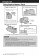 Charging the Battery Pack Attach the battery pack. Connect the DC connector. Cover * The battery pack is not charged at the time of purchase. AC Adapter To AC Outlet eAlign the top of the battery with the mark on this unit, and slide in until the battery clicks into place. m To detach the battery pack (Base) Plug in the power.