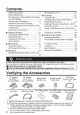 Contents Safety Precautions ............................... Model Differences ............................... 2 4 Precautions on Playing Back 3D Images (for GZ-HM960) ................................... 4 Verifying the Accessories .................... 6 Names of Parts and Functions ............. 7 Names of Buttons and Functions on the LCD Monitor ........................................ 8 Using the Touch Screen ...................... 9 _,Getting Started .........................
