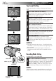 GETTING STARTED (cont.) EN Power Zoom Button Grip Adjustment 1 2 3 EXPAND LOOP Separate the Velcro strip. INSERT HAND Pass your right hand through the loop and grasp the grip. ADJUST STRAP LENGTH Adjust so your thumb and fingers can easily operate the Recording Start/Stop Button and Power Zoom Button. Refasten the Velcro strip. Recording Start/Stop Button Viewfinder Adjustment 3 1 1 2 2 3 Set POWER to “CAMERA”.