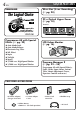 QUICK OPERATION GUIDE EN INSERTING A VIDEO CASSETTE SUPPLY POWER Hook on. 1 PUSH 2 Push in. EJECT 2 3 4 BATT. RELEASE Using the battery pack 1 Hook-on the battery pack’s top end to the 1 Open camcorder. (Charging procedure, Z pg. 6) 1 Open the LCD monitor to an angle of over place. 2 Press EJECT to open the cassette holder. 3 Insert a video cassette. 4 Press PUSH to close the cassette holder. 2 Push in the battery pack until it locks into To remove the battery pack Slide BATT.