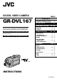 DIGITAL VIDEO CAMERA GR-DVL167 ENGLISH CONTENTS AUTOMATIC DEMONSTRATION GETTING STARTED 7 – 13 RECORDING & PLAYBACK Please visit our Homepage on the World Wide Web and answer our Consumer Survey (in English only): http://www.jvc-victor.co.jp/english/index-e.html For Accessories: http://www.jvc-victor.co.jp/english/accessory/ 6 14 – 22 RECORDING ................................ 15 – 18 PLAYBACK .................................. 19 – 22 ADVANCED FEATURES 23 – 51 FOR RECORDING .....................