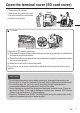 Open the terminal cover (SD card cover) A Open the LCD monitor. B Slide down the terminal cover lock and slide the cover aside (Rear) C Lift the cover slowly. o To close . Not properly closed if the red mark is visible! Leave the LCD monitor open first. A Flip down the cover slowly while making sure the gray waterproof seal fits into the opening at the terminals. B Press the entire cover against the camcorder with equal force and firmly attach the cover completely.