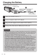 Charging the Battery A battery is built into the camcorder. Charging Lamp A B Adapter Cable (Provided) C To AC Outlet (110 V to 240 V) . D AC Adapter (Provided) 1 Open the terminal cover (p. 7) 2 Connect adapter cable to AC adapter. 3 Plug in the AC adapter to AC outlet (110 V to 240 V). 4 Connect the other side to USB socket on the unit.