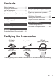 Contents Safety Precautions ................................. 2 Verifying the Accessories ...................... 5 Grip Belt Adjustment .............................. 6 Date and Time Setting ........................... 6 Open the terminal cover (SD card cover) ...... 7 Getting Started Charging the Battery .............................. 8 Inserting an SD Card ............................. 9 Recording Video Recording ..................................