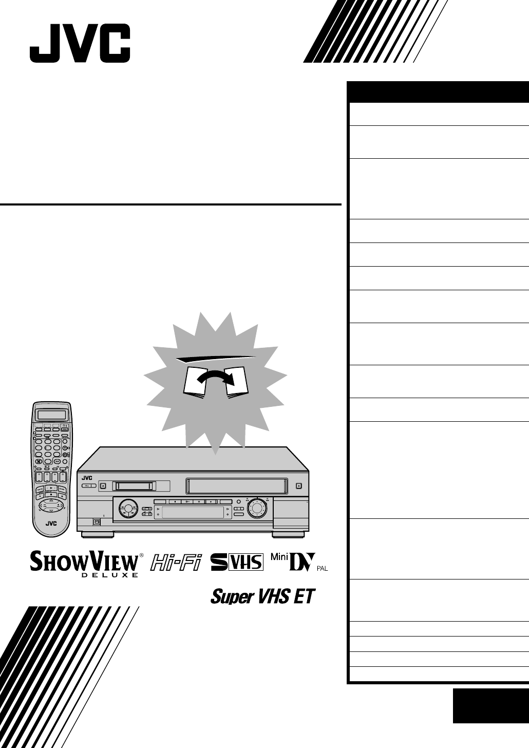 ENGLISH CONTENTS SAFETY FIRST 2 Safety Precautions ................................... 2 INSTALLING YOUR NEW RECORDER Mini DV/S-VHS VIDEO CASSETTE RECORDER HR-DVS2EU 4 Basic Connection .................................... 4 S-VIDEO Connection .............................. 5 INITIAL SETTINGS 6 Auto Set Up ............................................ 6 Preset Download ..................................... 8 Language .............................................. 10 On-Screen Displays ..............