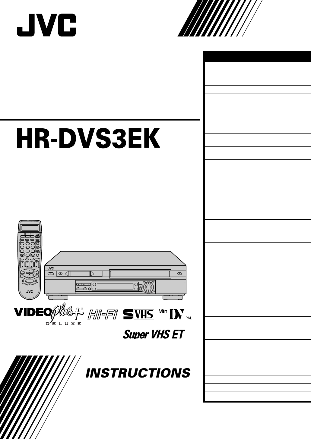 Filename [DVS3EK_Cov1-EN.fm] DVS3EK_1-EN.book Page 1 Monday, November 5, 2001 1:43 PM CONTENTS SAFETY FIRST 2 Safety Precautions .....................................2 Some Do’s And Don’ts On The Safe Use Of Equipment ............................................3 Mini DV/S-VHS VIDEO CASSETTE RECORDER INDEX INSTALLING YOUR NEW RECORDER 4 10 Check Contents .......................................10 Basic Connections ...................................11 S-VIDEO Connection ...............................
