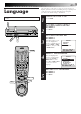 EN This VCR offers you the choice to view on-screen messages in English, Spanish or French (not including messages superimposed on the TV picture). Select the desired language using this procedure. The default setting is "ENGLISH". Language 1 CH POWER Turn on the TV and select the VCR channel 3 or 4 (or AV mode). − + JOG 2 M OK EN U SHATTLE 3 TURN ON THE VCR Press POWER. ACCESS MAIN MENU SCREEN Press MENU.