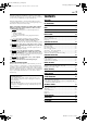 Filename [XV48EX_EN_11Trouble.fm] Masterpage:Left0 XV48EX_EN_01.book Page 70 Saturday, October 9, 2004 10:34 PM 70 EN SPECIFICATIONS GENERAL VIDEO/AUDIO (DVD deck) Power requirement : AC 220 V – 240 V , 50 Hz/60 Hz Power consumption Power on : 23 W Power off : 4.0 W Temperature Operating : 5°C to 40°C Storage : –20°C to 60°C Operating position : Horizontal only Dimensions (WxHxD) : 435 mm x 93 mm x 272 mm Weight : 4.2 kg Format : VHS PAL standard Maximum recording time (SP) : 240 min.