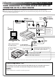8 SU LIITÄNNÄT (käytettäessä JLIP-kuviensieppausohjelmaa) n Varmista, että virta on katkaistu kaikista laitteista ennen kuin alat tehdä liitäntöjä. n Videokuvat näkyvät TV-ruudussa. Kuvia ei saada näkyviin tietokoneen näyttöön. n Kun liität varusteisiin kuuluvia johtoja, liitä ydinsuodattimella varustetut liittimet kuviensieppausrasiaan. Liitä TVvastaanottimeen tai kuvanauhuriin, jossa on AV-liitin TV (aseta tulon valintakytkin asentoon VIDEO (EXT.