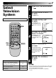 EN Fine-Tuning Channels 1 2 3 Perform steps 1 – 3 of "Auto Channel Set" on page 24. ACCESS CHANNEL LIST Press PUSH JOG %fi to place the pointer next to "CH EDIT", then press OK. SELECT CHANNEL TO FINE-TUNE ● The "FRQ" number for that channel starts blinking. 4 5 TV System Selection – When you see the picture but hear no audio ACCESS TUNER SET SCREEN Press PUSH JOG %fi until the channel you want to tune begins blinking, then press OK twice.