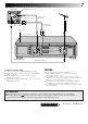 STEP QUICK SET UP GUIDE (cont.) 2 INSTALLATION CONNECT VIDEO RECORDER TO TV Place the recorder on a stable, flat surface. Back of TV RF Cable (provided) 21-pin SCART Cable (not provided) Aerial connector 21-pin AV input connector (SCART) Make this connection if your TV has a 21-pin AV input connector (SCART) in order to reduce the possibility of interference. And if you are using a stereo TV, you will need this cable in order to enjoy stereo playback of videotapes.