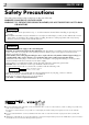 SAFETY FIRST Safety Precautions The rating plate and the safety caution are on the rear of the unit. WARNING: DANGEROUS VOLTAGE INSIDE WARNING: TO PREVENT FIRE OR SHOCK HAZARD, DO NOT EXPOSE THIS UNIT TO RAIN OR MOISTURE. IMPORTANT 䡲 Please read the various precautions on p. 2 – 4 of this instruction manual before installing or operating the recorder.
