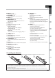English PREPARATION WATCHING TV OPTIONAL SETTING OPERATING DVD 23. PAUSE F (p. 17) TV mode • Press to pause screen image. DVD mode • Press to pause the disc playback. 24. CLEAR (p. 39) • Press to clear the numbers entered incorrectly. • Press to cancel the point A for A-B repeat. • Press to remove the track number in program input (CD). 25. MODE (p. 5) • Press to arrange the playing order or playback randomly (CD). • Press to set the black level (DVD) and the virtual surround on or off.