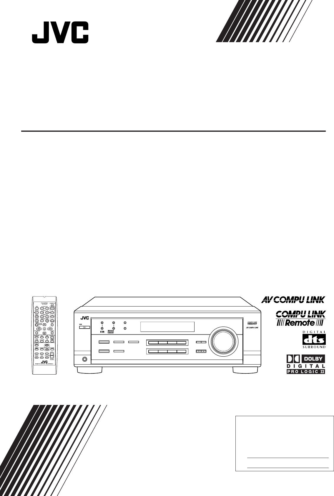 AUDIO/VIDEO CONTROL RECEIVER RECEPTEUR DE CONTROL AUDIO/VIDEO RX-6020VBK RX-6020V AUDIO/VIDEO CONTROL RECEIVER FM/AM TUNING FM/AM PRESET FM MODE STANDBY PTY–PTY SEARCH–PTY MASTER VOLUME MEMORY STANDBY/ON SURROUND ON/OFF INPUT ANALOG INPUT DIGITAL ADJUST SETTING DVD MULTI FM MODE DVD VCR TV SOUND TAPE/CDR FM AM INPUT ATT SURROUND MODE CONTROL DOWN UP SPEAKERS ON/OFF CD SOURCE NAME PHONES INSTRUCTIONS MANUAL D’INSTRUCTIONS For Customer Use: Enter below the Model No.