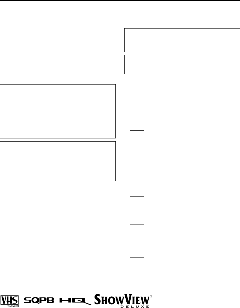 ● Des cassettes marquées “VHS” (ou “S-VHS”) peuvent être utilisées avec ce magnétoscope. Toutefois, l’enregistrement S-VHS n’est