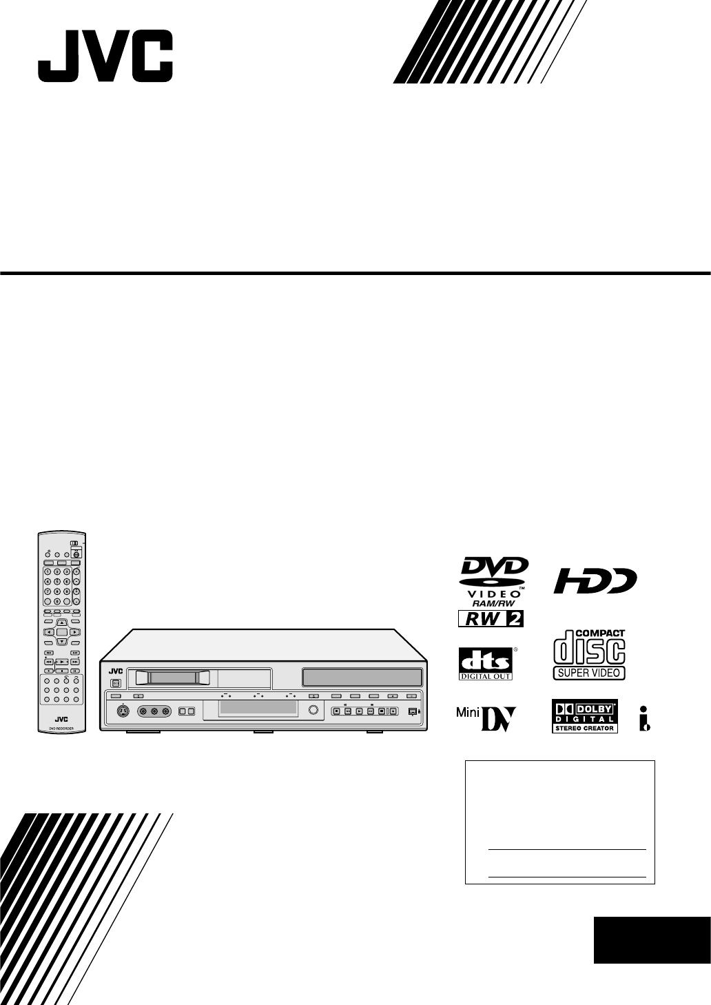EN SAFETY FIRST Dear Customer, Thank you for purchasing the JVC Mini DV & HDD & DVD video recorder. Before use, please read the safety information and precautions to ensure safe use of your new unit. Cautions CAUTION AVIS RISQUE DE CHOC ELECTRIQUE RISK OF ELECTRIC SHOCK - NE PAS OUVRIR. DO NOT OPEN This Class B digital apparatus complies with Canadian ICES-003. Cet appareil numérique de la classe B est conforme à la norme NMB-003 du Canada.