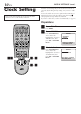 EN INITIAL SETTINGS (cont.) Clock Setting Turn on the VCR and the TV, and select the VCR channel 3 or 4 (or AV mode) on the TV. Perform clock setting only if the clock has not been set correctly by the Plug & Play setting or if you use a cable box. Access the Clock Set screen to perform the Semiauto or Manual Clock Set. Each procedure starts from step 4 after preparation steps below are finished. If you use a cable box, set the clock manually. (Z pg.