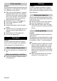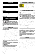Î Pull on the lever of the trigger gun; the device will switch on. Note: Release the lever of the trigger gun; the device will switch off again. High pressure remains in the system. Spray lance with high pressure nozzle For normal cleaning tasks. Not suitable for use with detergents. STEP 4: Î Connect the high pressure nozzle and press the hand trigger to begin cleaning. Start up Caution Dry runs lasting longer than two minutes lead to damages to the high pressure pump.