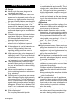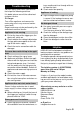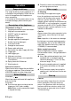 Connect the high pressure hose to the high pressure connection of the appliance. Push the spray lance into the trigger gun and fasten it by turning it through 90°. Completely open the water tap. Insert the mains plug into the socket. Turn on the appliance “I/ON”. Operation 몇 Danger The trigger gun is subjected to a recoil force when the water jet is discharged. Make sure that you have a firm footing and are also holding the trigger gun and spray lance firmly.