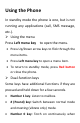 Using the Phone In standby mode the phone is one, but is not running any applications (call, SMS message, etc.). Using the menu Press Left menu key to open the menu. Press Up/Down arrow keys to flick through the menu items. Press Left menu key to open a menu item. To return to standby mode, press Red button or close the phone. Dual-function keys Some keys have additional functions if they are pressed and held down for a few seconds. Number 1 key: Listen to mailbox.