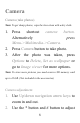 Camera Camera (take photos) Note: To get sharp photos, wipe the lens clean with a dry cloth. 1. Press shortcut camera button. Alternatively press Menu->Multimedia->Camera. 2. Press Camera button to take photo. 3. After the photo was taken, press Options to Delete, Set as wallpaper or go to Image viewer for more options. Note: To store more pictures you need a micro SD memory card up to 16 GB. (Not included in the accessories) Camera adjustiment 1. Use Up/down navigation arrow keys to zoom in and out. 2.