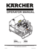 OPERATOR MANUAL ER IN G RN BU W A R N TT N/A TIO N TIO EN AU EC PR GINE EN ON I ER RN R BU MADOR QUE LEU BRU G IN AT ER IONS OP CT RU INST S IONE N CC RU ACIO INST OPER DE DE MO PLOI D’EM E UR AT ER RARE MP ATU ATU TE TEMPER PER TEM F OF O ST GL ON F OF 98034360-1 MODEL # ORDER # HDS 5.6/35 De Cage 1.110-622.0 HDS 5.6/35 De Cage 1.110-623.0 To locate your local Kärcher Commercial Pressure Washer Dealer nearest you visit www.karchercommercial.us 01/27/21 9.803-436.